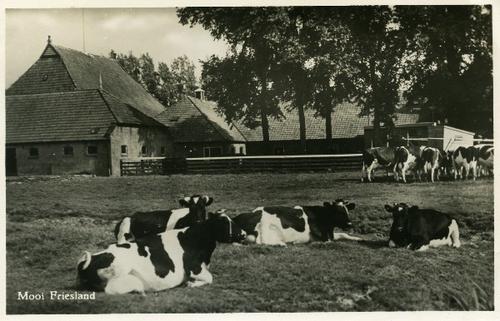Prentbriefkaart in zwart-wit van koeien en een melkm...
