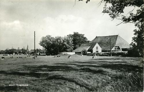 Prentbriefkaart in zwart-wit van een boerderij met k...