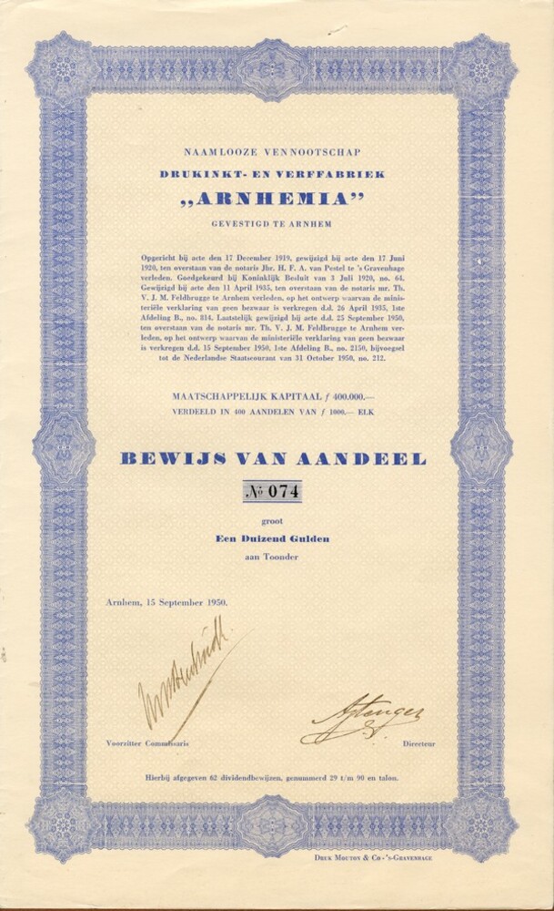 Bewijs van aandeel van drukinkt en verffabriek Arnhe...