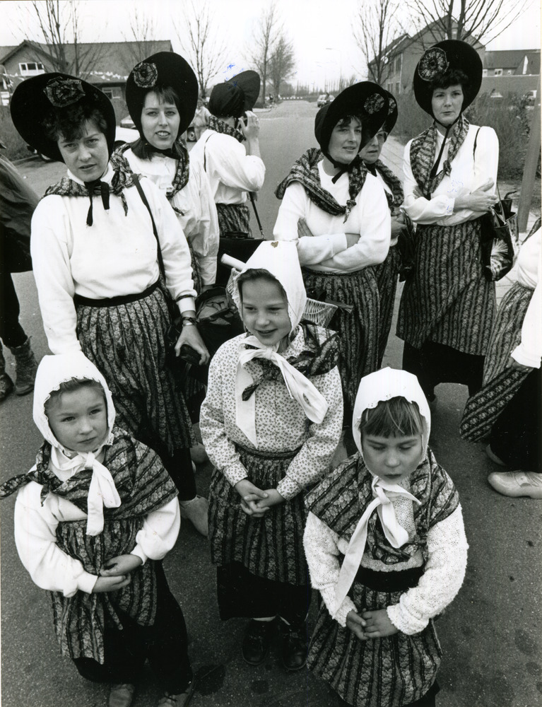 Zwart-wit foto van de carnavalsoptocht met de Riensp...