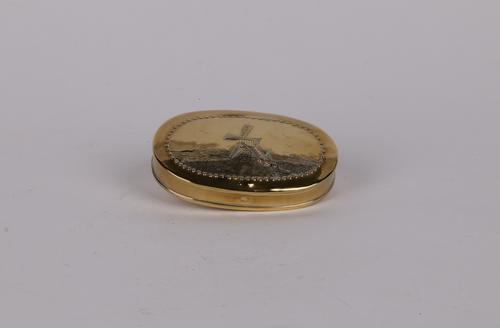 Koperen tabaksdoos met molen aan het water