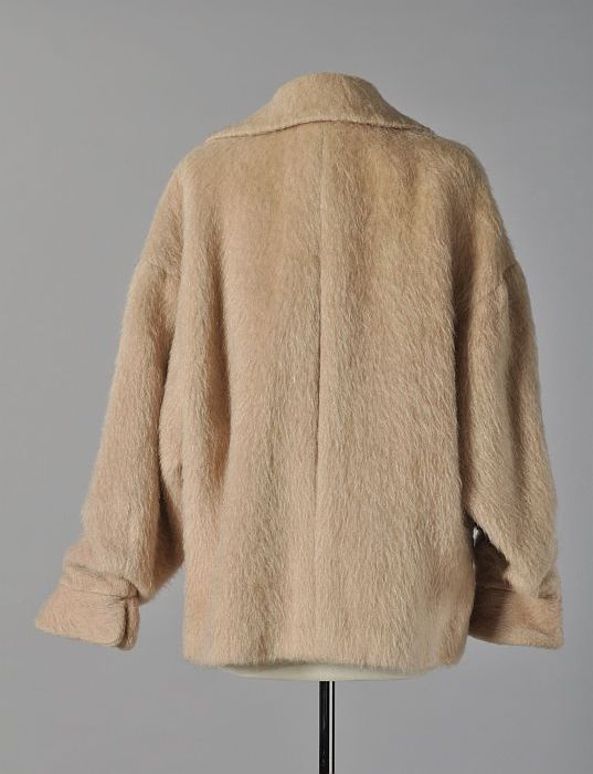 Heuplange jas, beige wollen damesjas met brede kraag...
