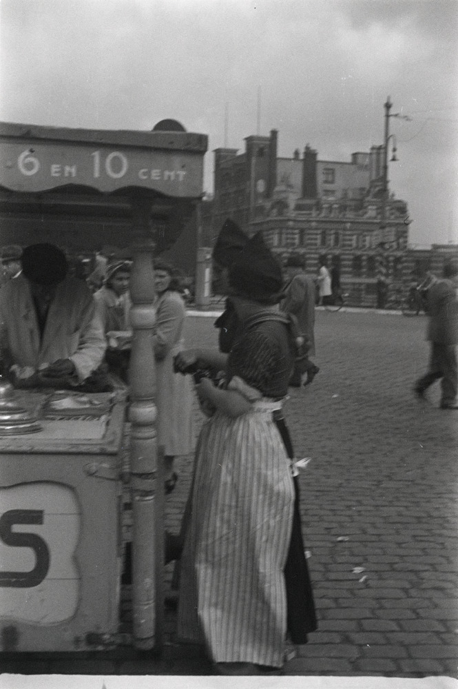 Vrouw in klederdracht bij een ijskar op de De Ruijte...