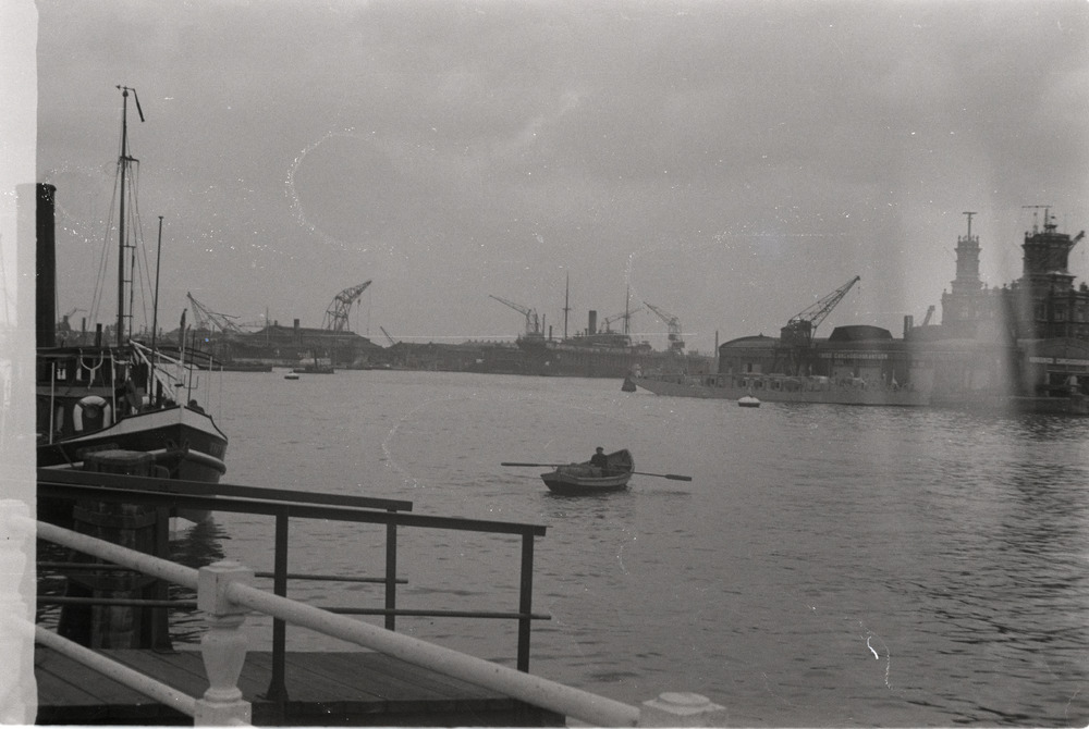 De haven van Amsterdam, rechts het gebouw van de Alg...