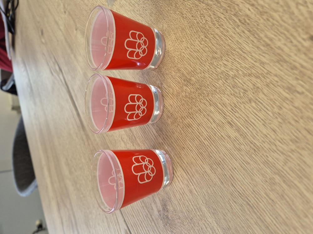 Drie borrelglazen met oranje opdruk Olympische Zomer...