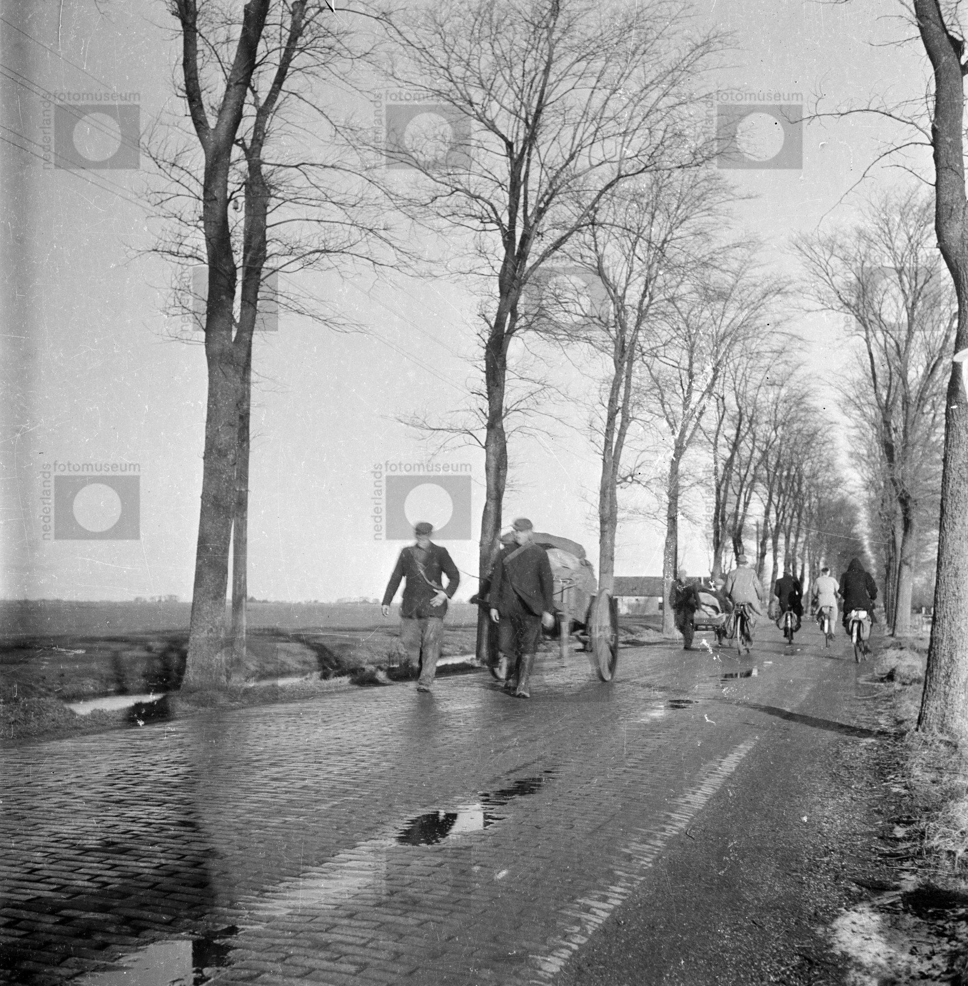 Mensen lopen en fietsen in de Hongerwinter over een ...