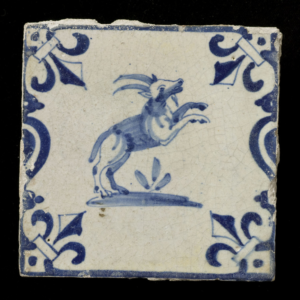 Tegel in tinglazuur, voorstellende bok, ca. 1625-1650