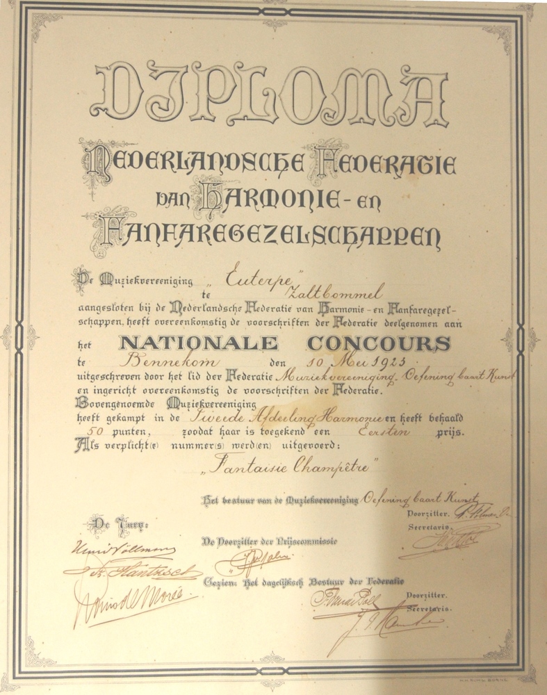 Diploma behaald door Euterpe te Zaltbommel. 1e prijs...