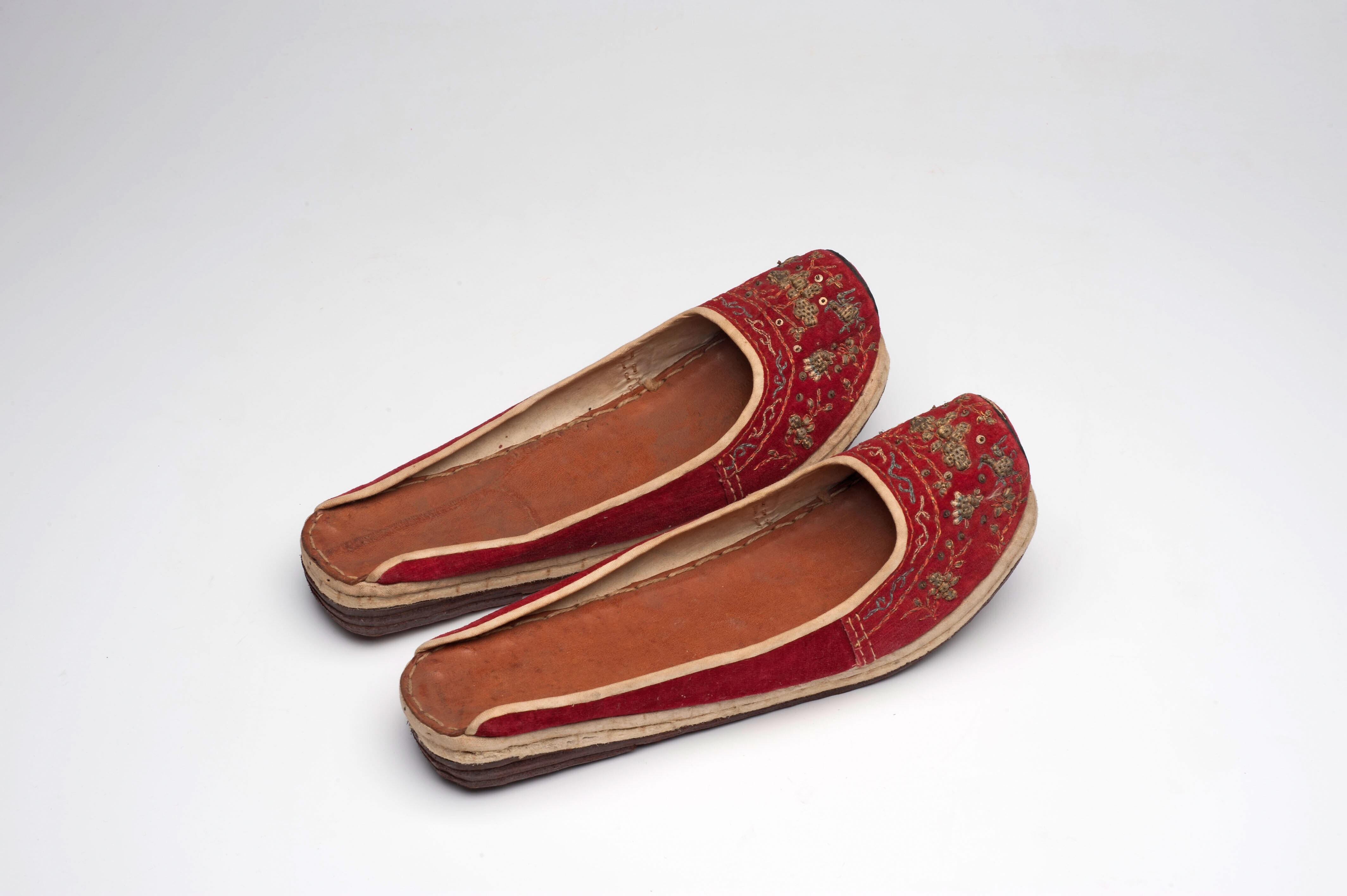 Een paar rood fluwelen muiltjes, versierd met gebord...