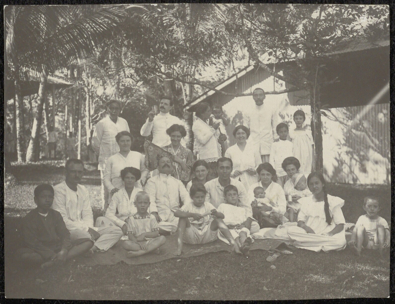 Groepsportret van vrouwen en kinderen, zittend voor ...