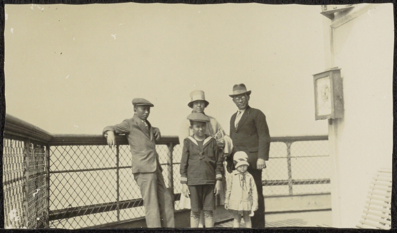 Groepsportret van een familie aan boord van een schip