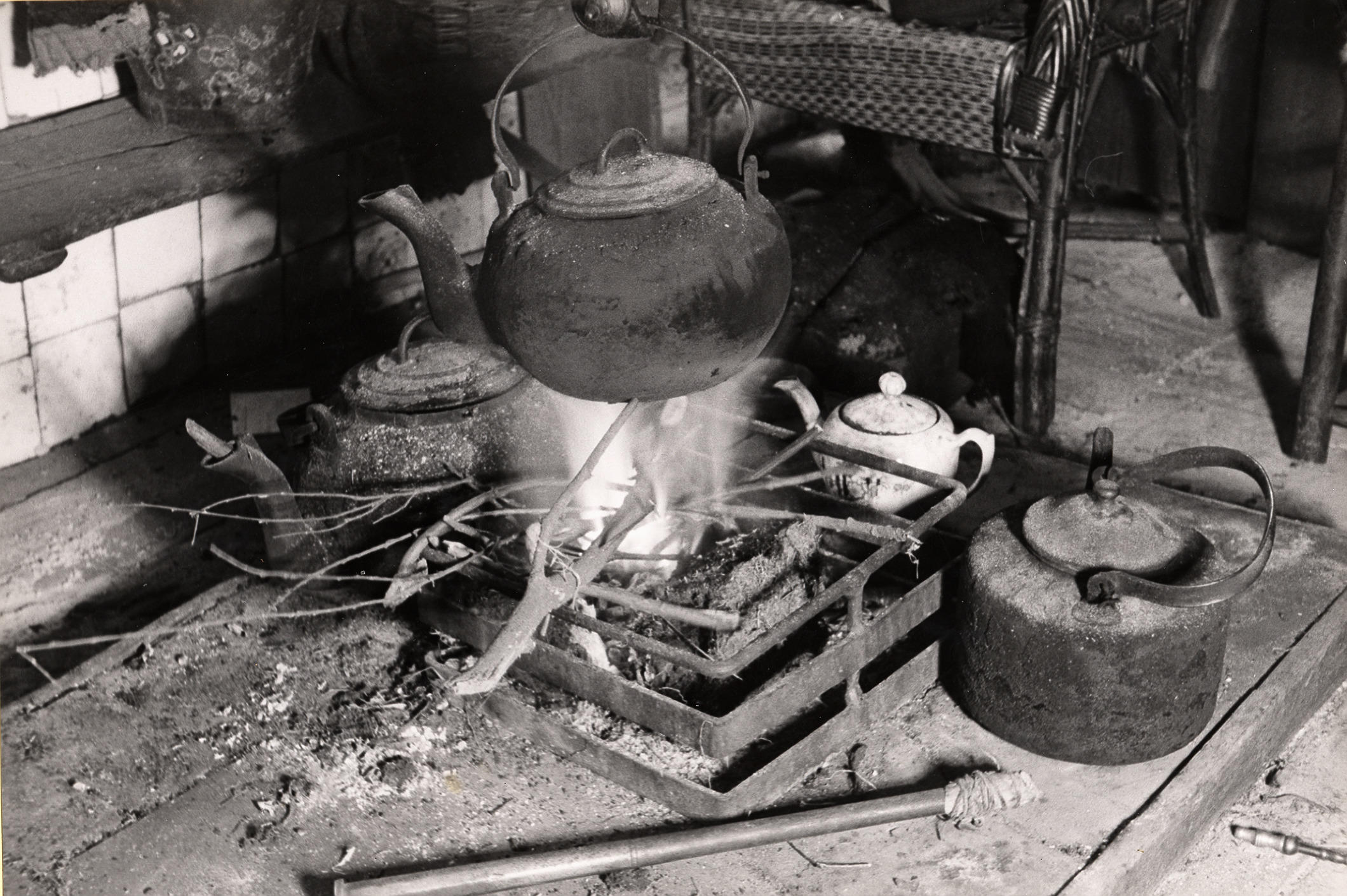 Vuurplaats met open vuur, Rouveen, 1944 (zwart-wit f...