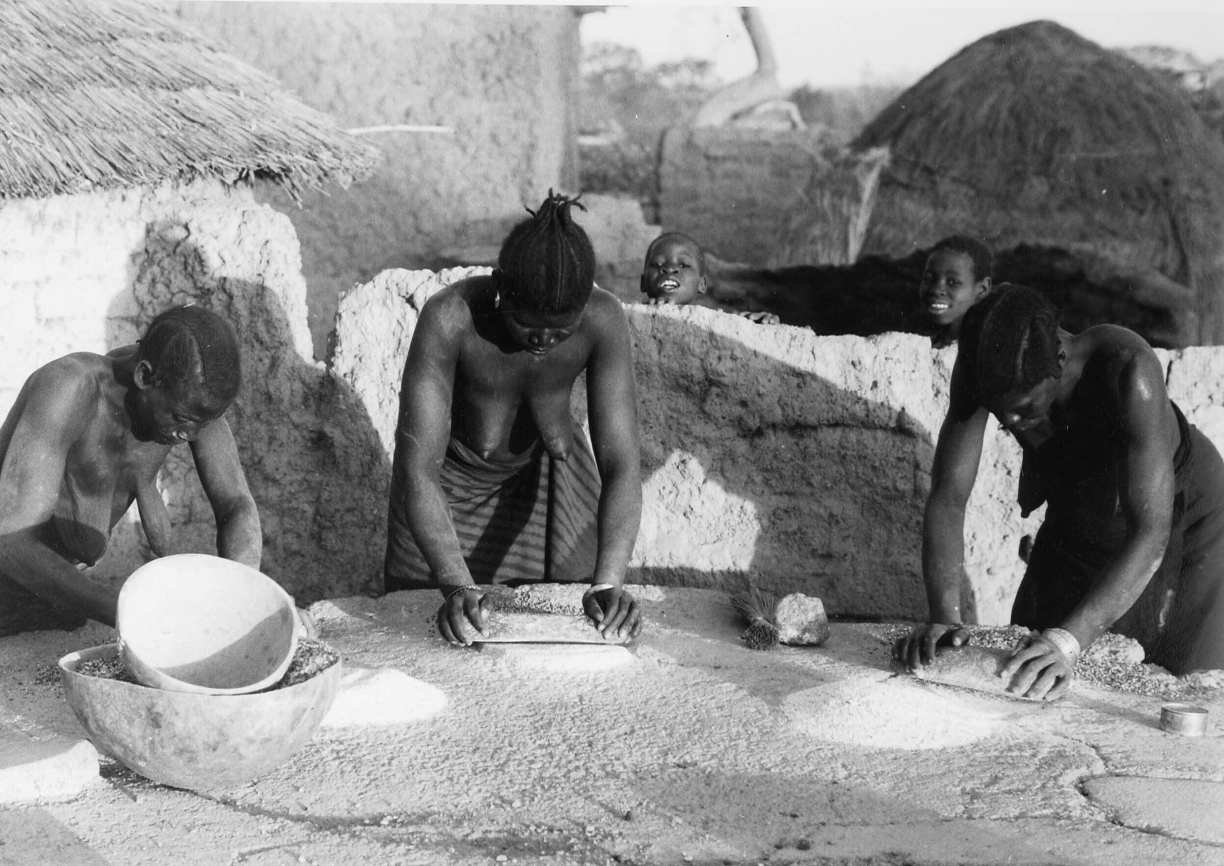 Een Mossi vrouw maalt gekookte bonen op haar erf in ...