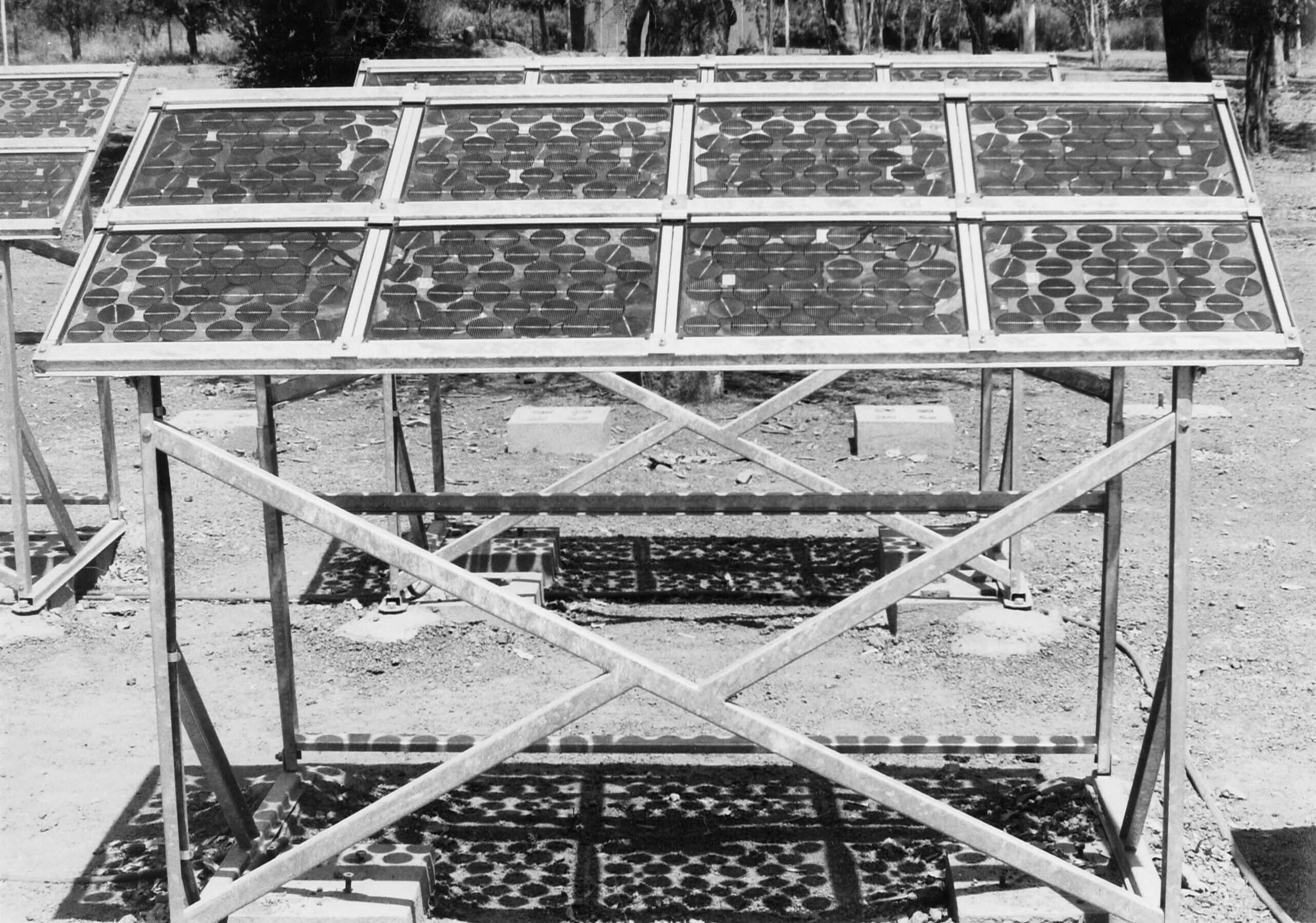 Overzichtsopname van zonnepanelen, een stroomomvorme...