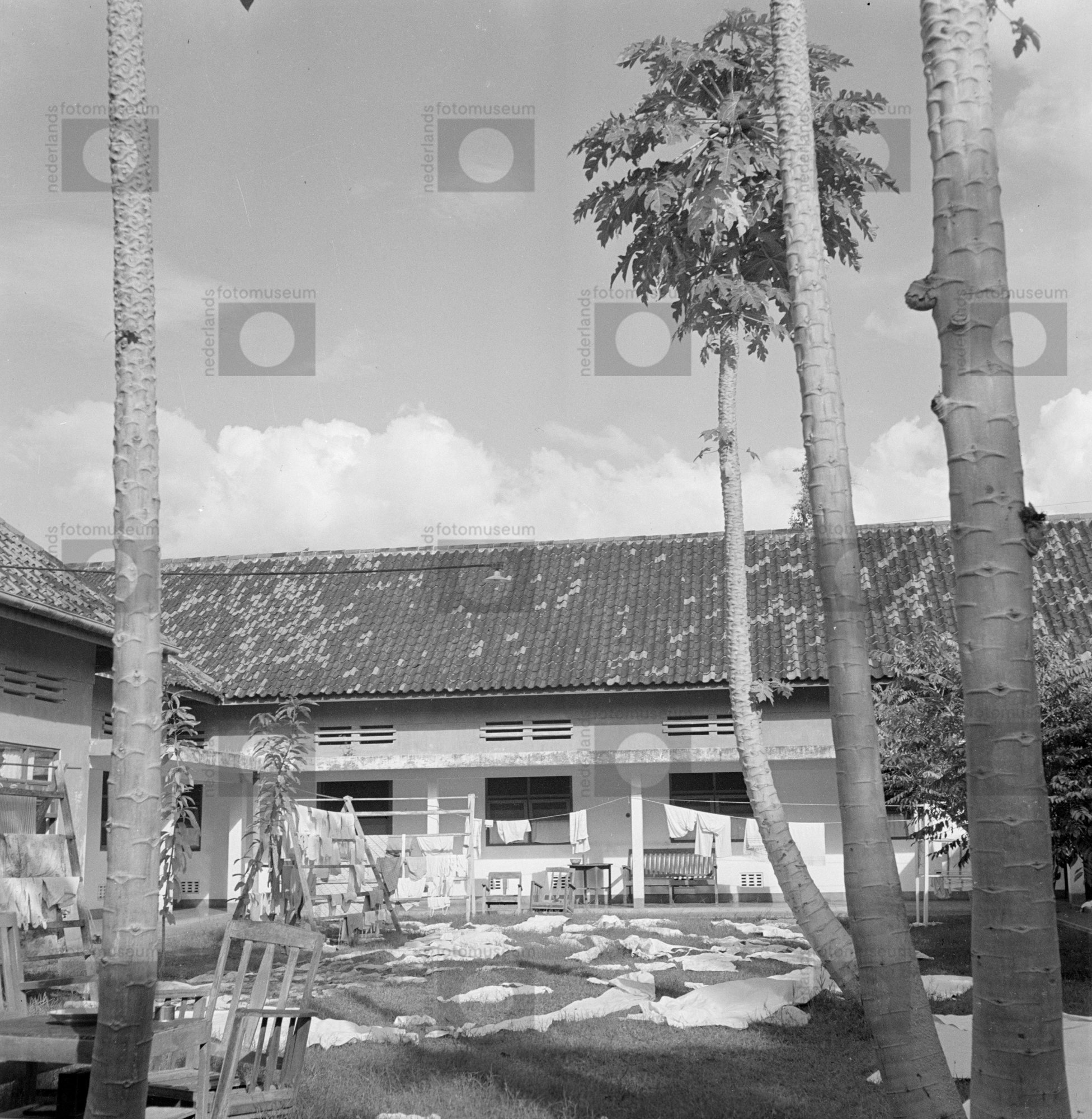 Op de binnenplaats van een kraamkliniek hangt en lig...