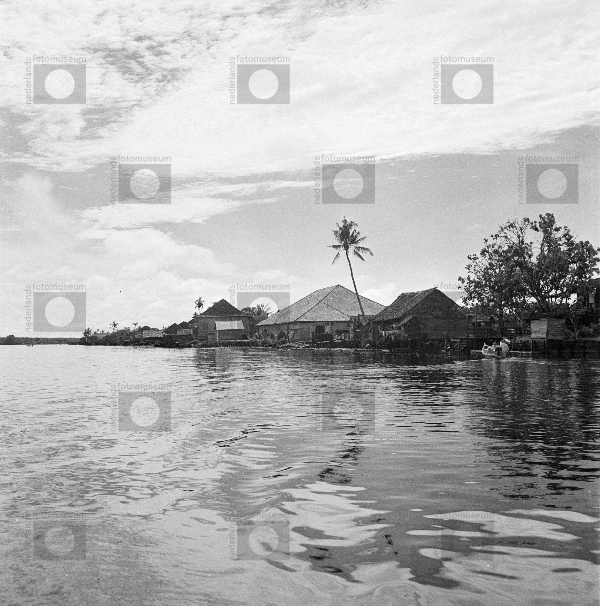 Overlangs riviergezicht met bebouwing aan de oever, ...