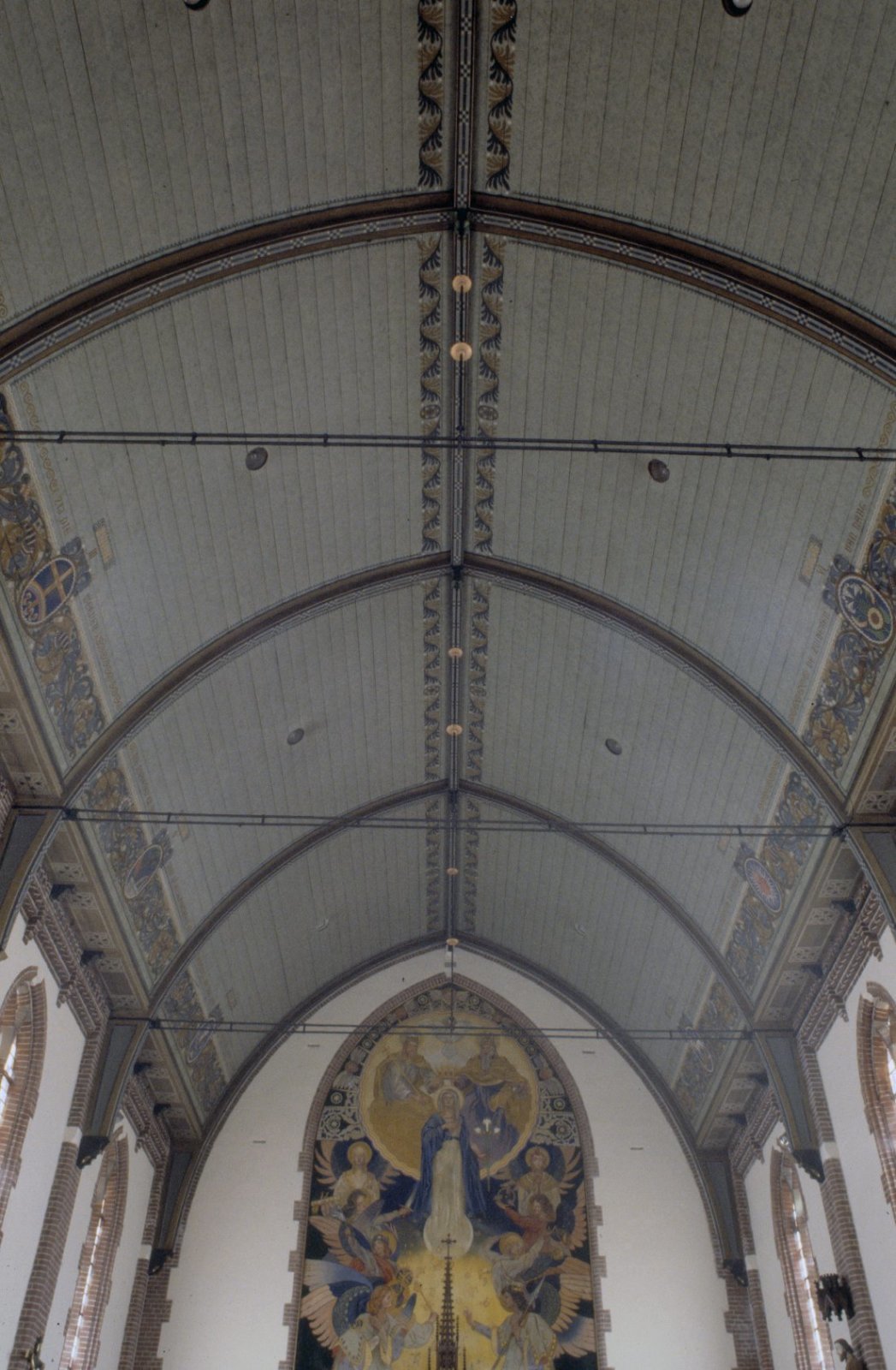 Interieur, overzicht houten tongewelf, richting het ...