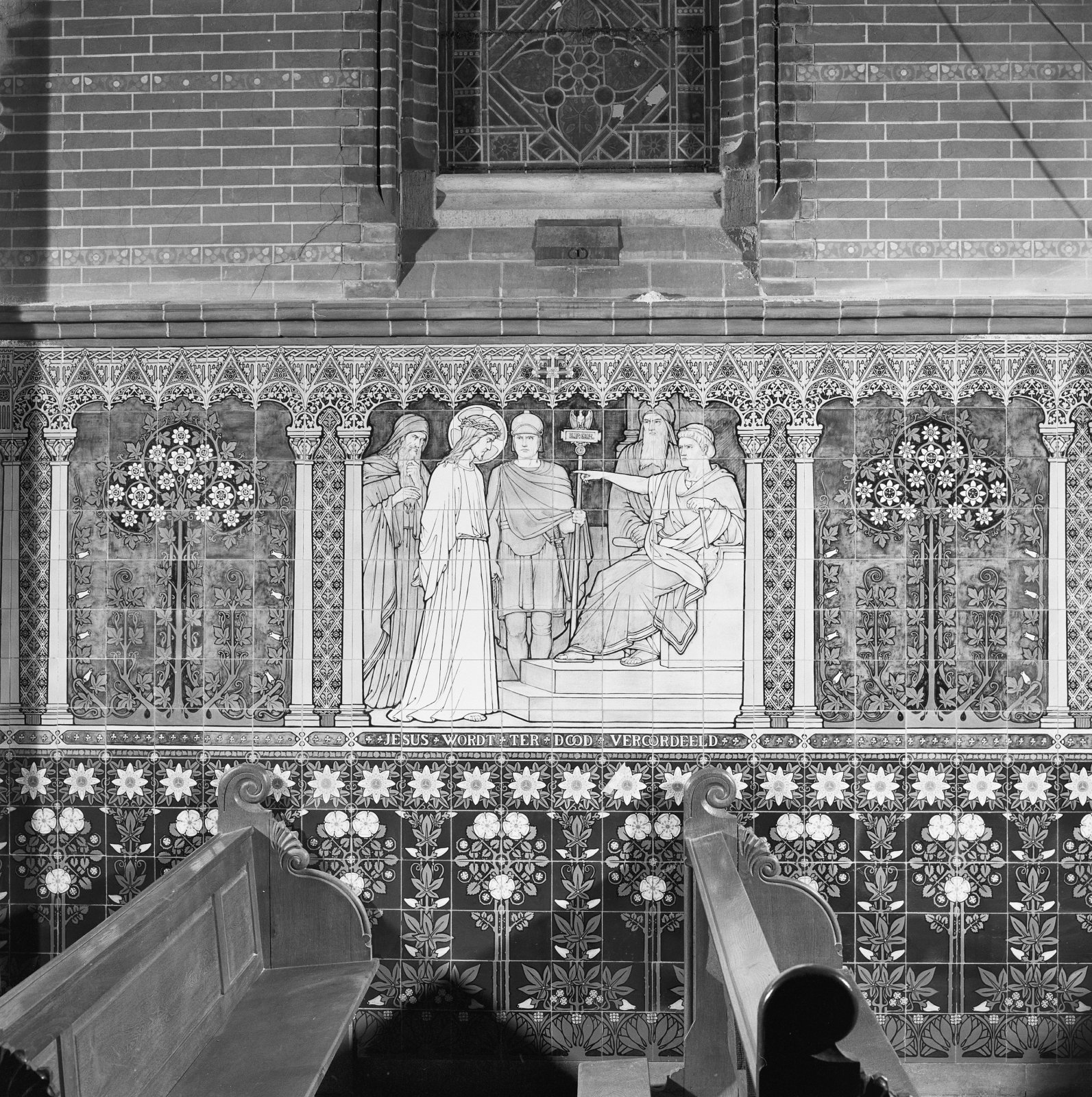 Interieur, tegeltableau met kruiswegstatie: Jezus wo...
