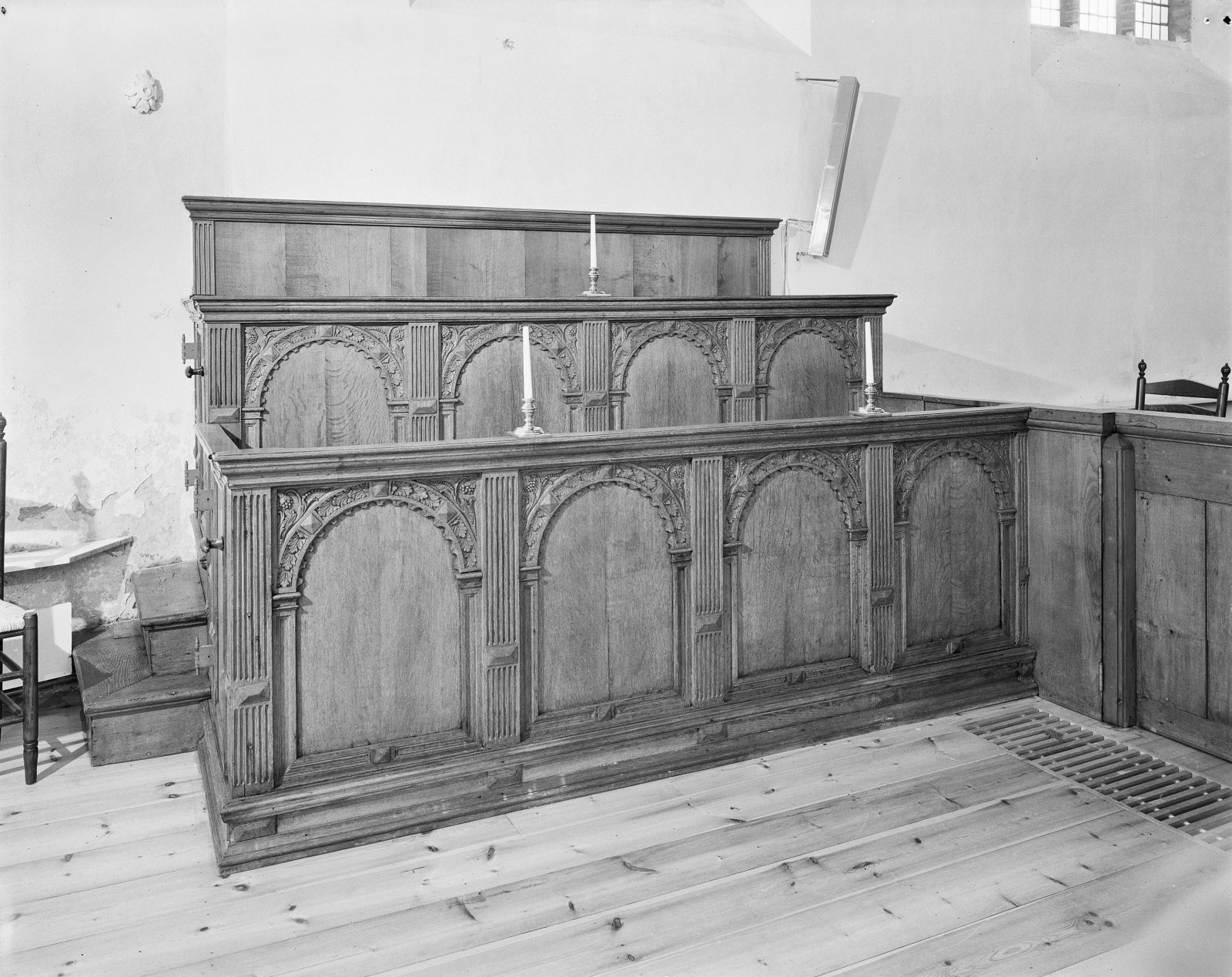 Interieur, bank rechts in het koor
