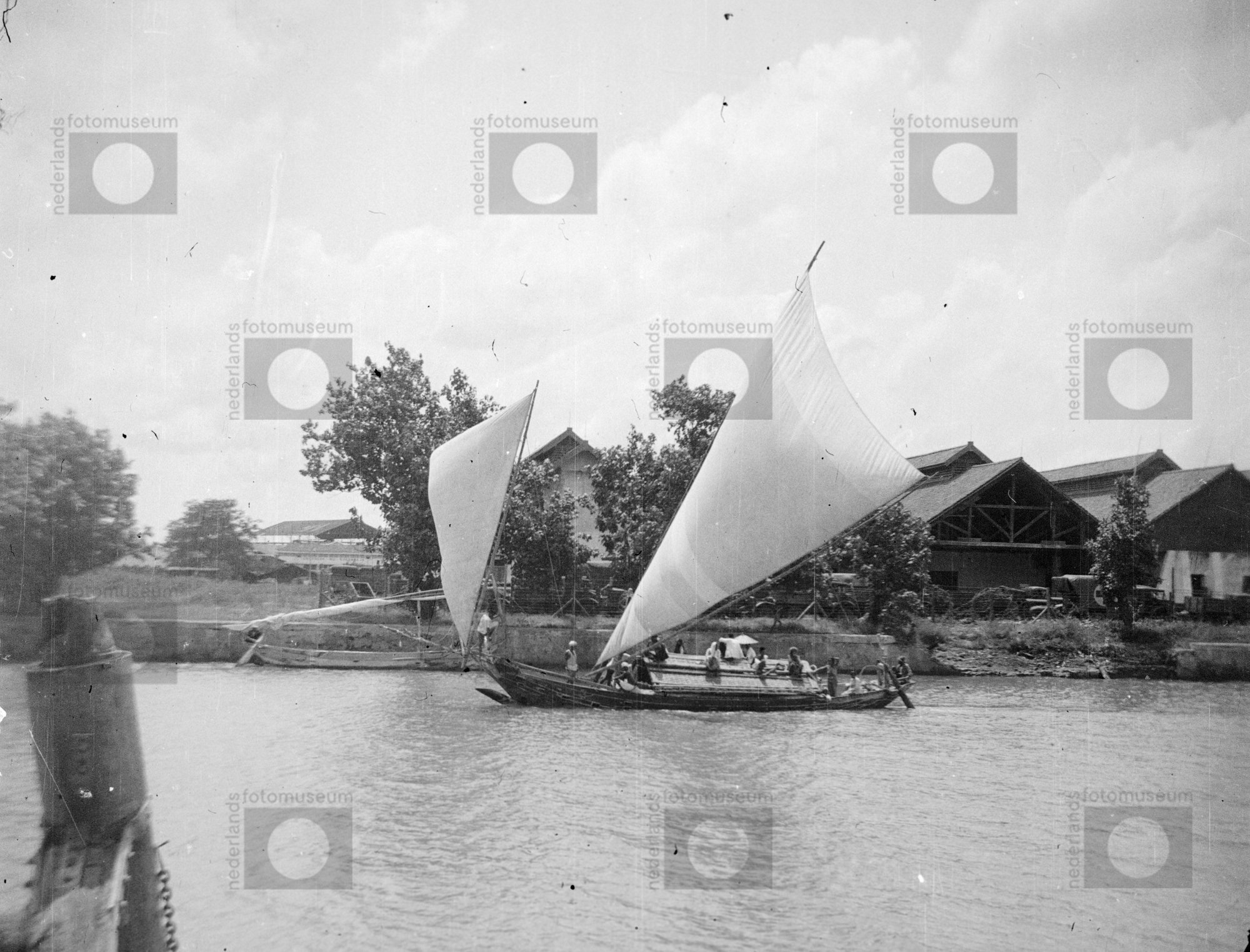 Zeilboot met opvarenden op rivier nabij Madura, Indo...