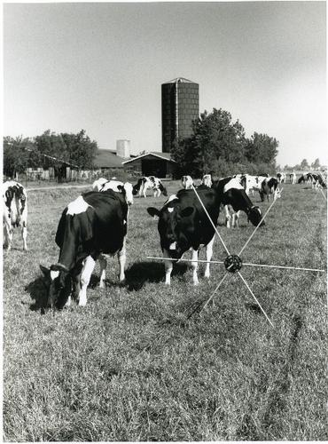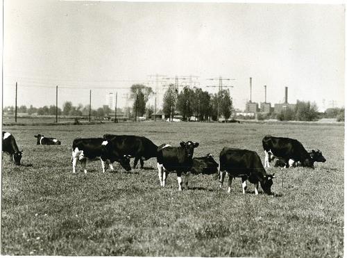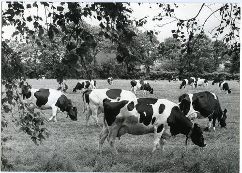 Foto in zwart-wit van een weiland met koeien en een ...