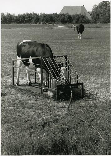 Foto in zwart-wit van een koe bij een installatie vo...