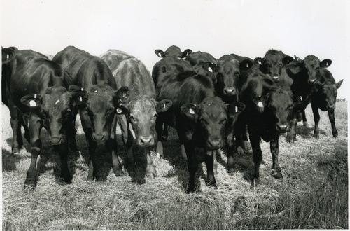 Foto in zwart-wit van een groep zwarte koeien door J...