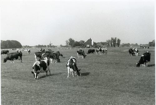 Foto in zwart-wit van koeien in een weiland bij een ...