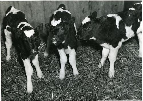 Foto in zwart-wit van drinkende kalveren in een stal...