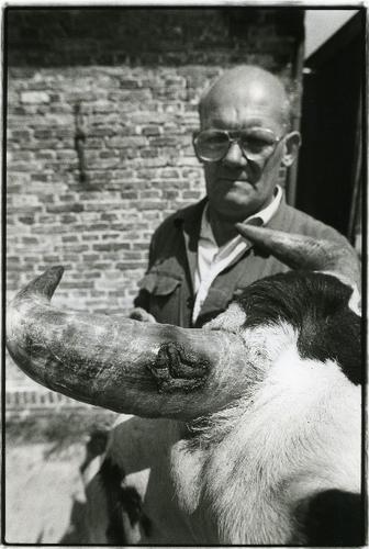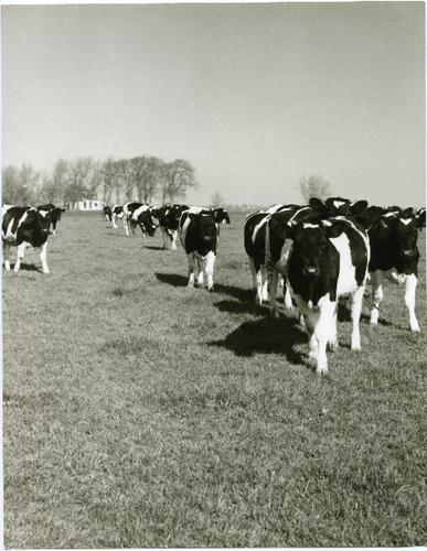 Foto in zwart-wit van een Lakenvelder stier, 1968