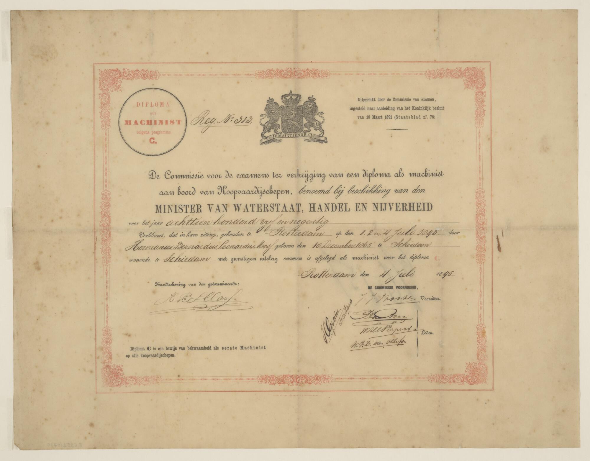 Diploma voor Machinist C, gedateerd 4 juli 1895, op ...