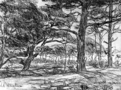 Zware beukenstam, grijs, tegen oplopende bruine grond