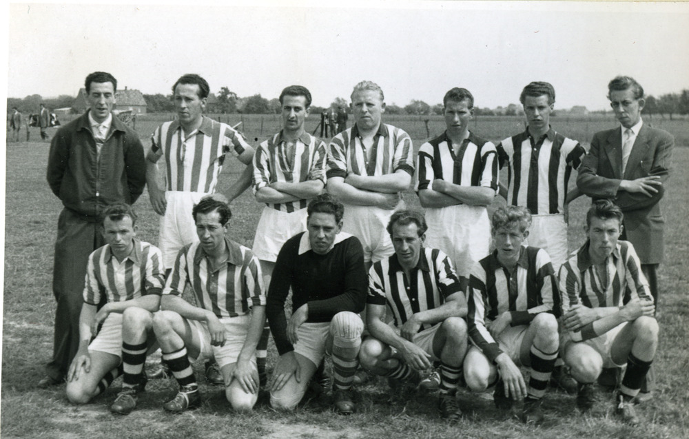 Zwart-wit foto van voetbalclub Carvium bij hun kampi...