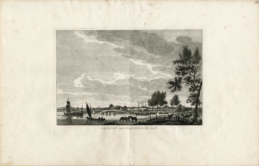 Gravure op papier met de titel 'Gezicht van t'Pander...