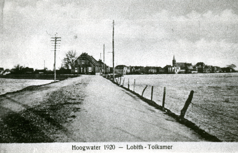 Zwart-wit foto van hoogwater in Lobith in 1920