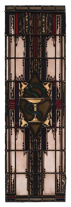 Glas-in-loodraam apotheek, met slang om schaal