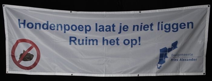 Witte vlag met lichtblauwe letters: "Hondenpoep laat...