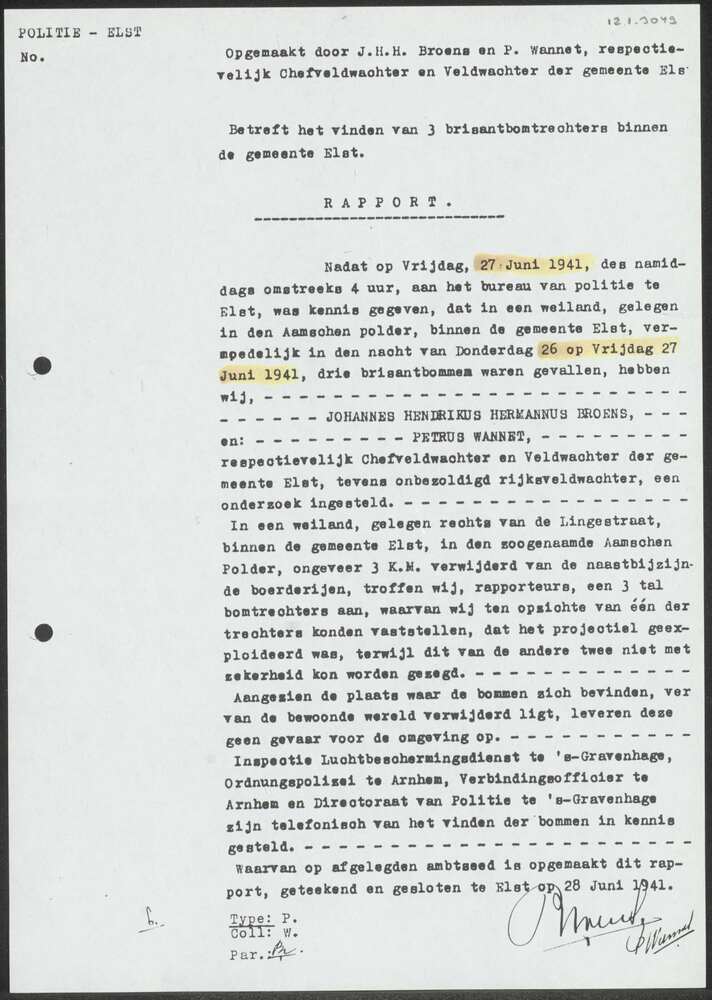 Proces-verbaal van 28-06-1941 over het vinden van 3 ...