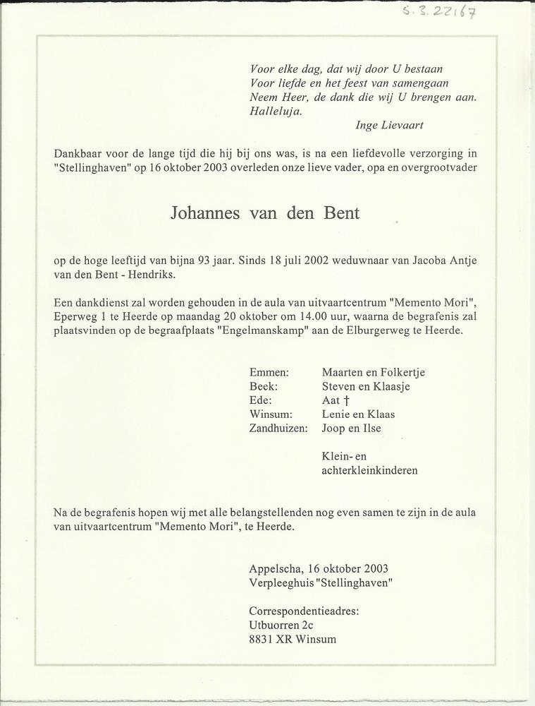 Rouwkaart oud-verzetsstrijder Ede Johannes van den Bent