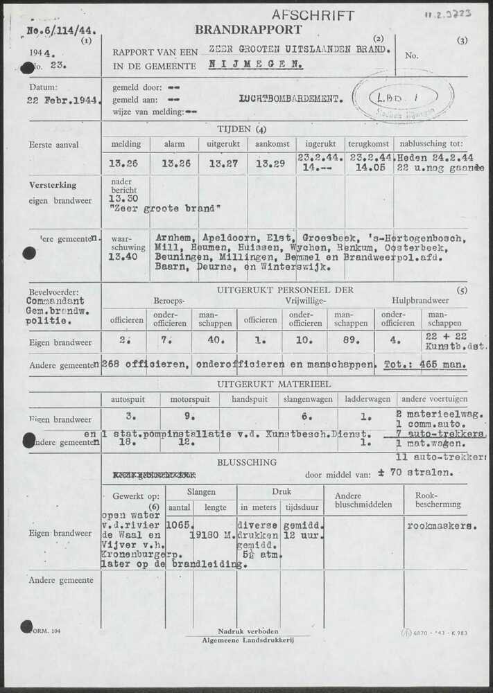Afschrift brandrapport No. 6/114/44 gemeente Nijmege...