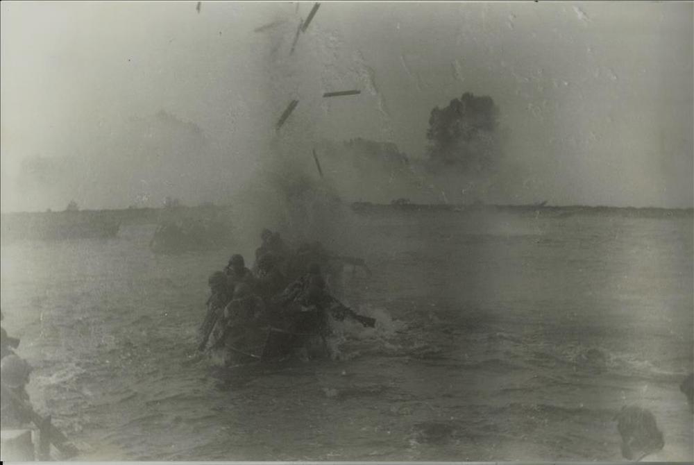 Waaloversteek, canvasboot, waterzuil, explosie