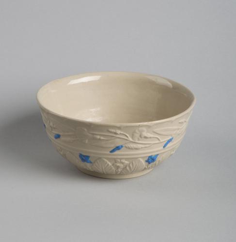 Spoelkom met relief bloem en blad in blauwe accenten
