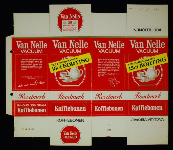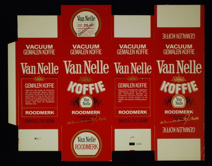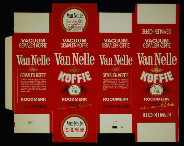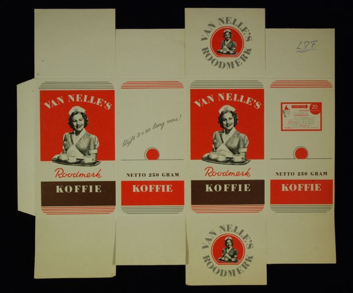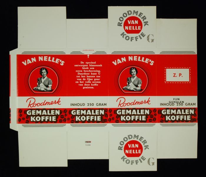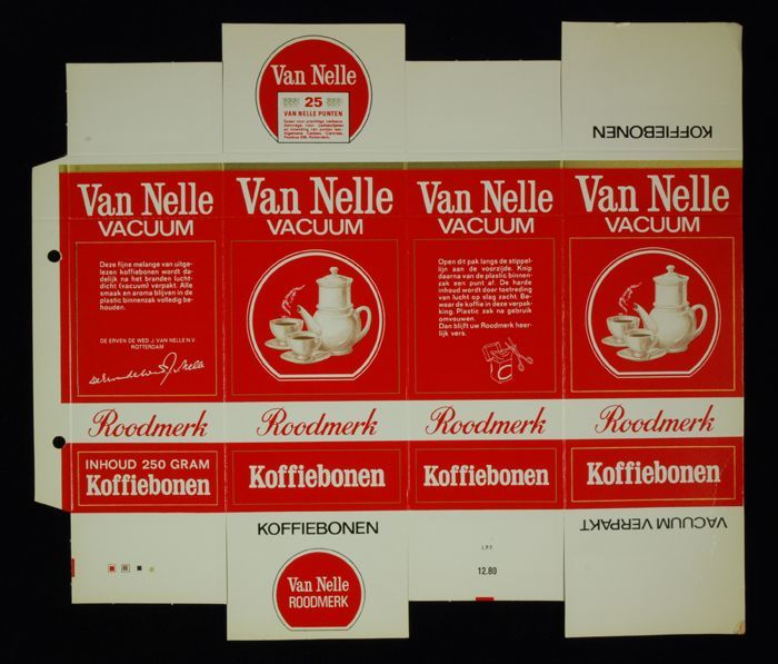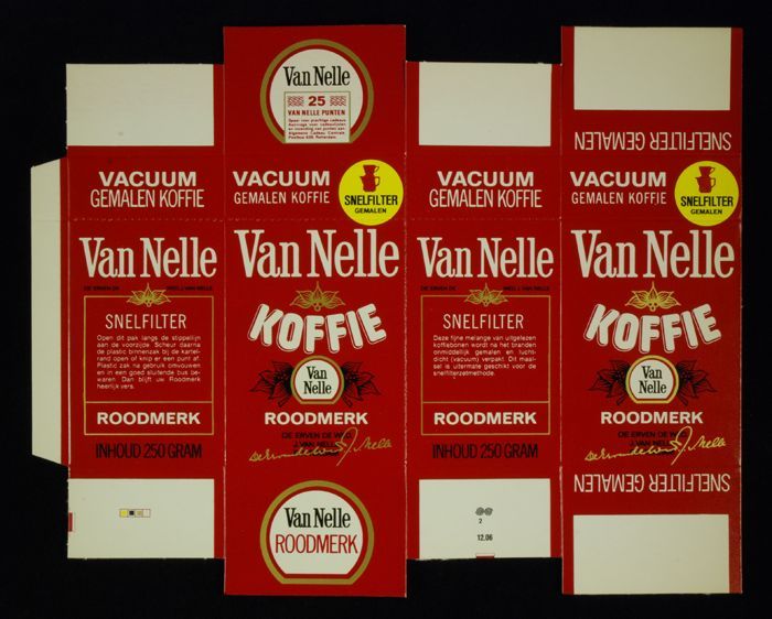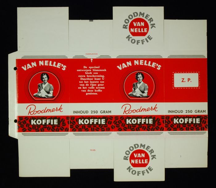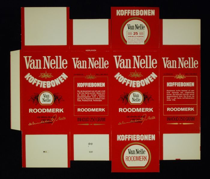 Ongevouwen, wit en rood, kartonnen pak VAN NELLE ROO...
