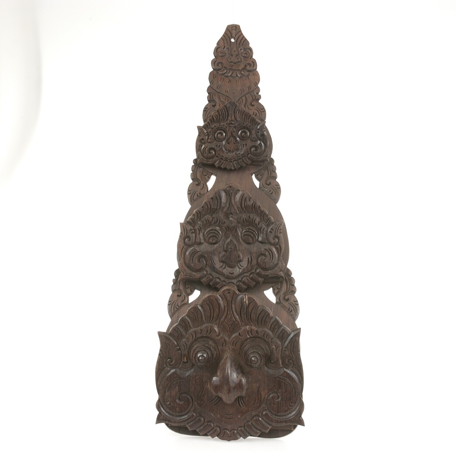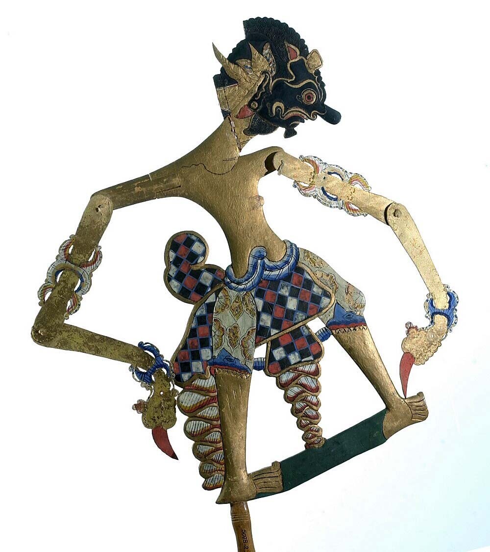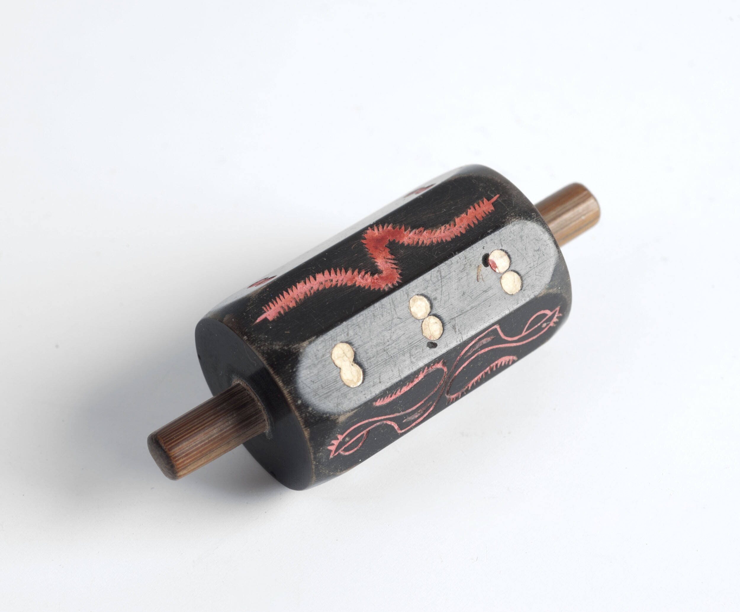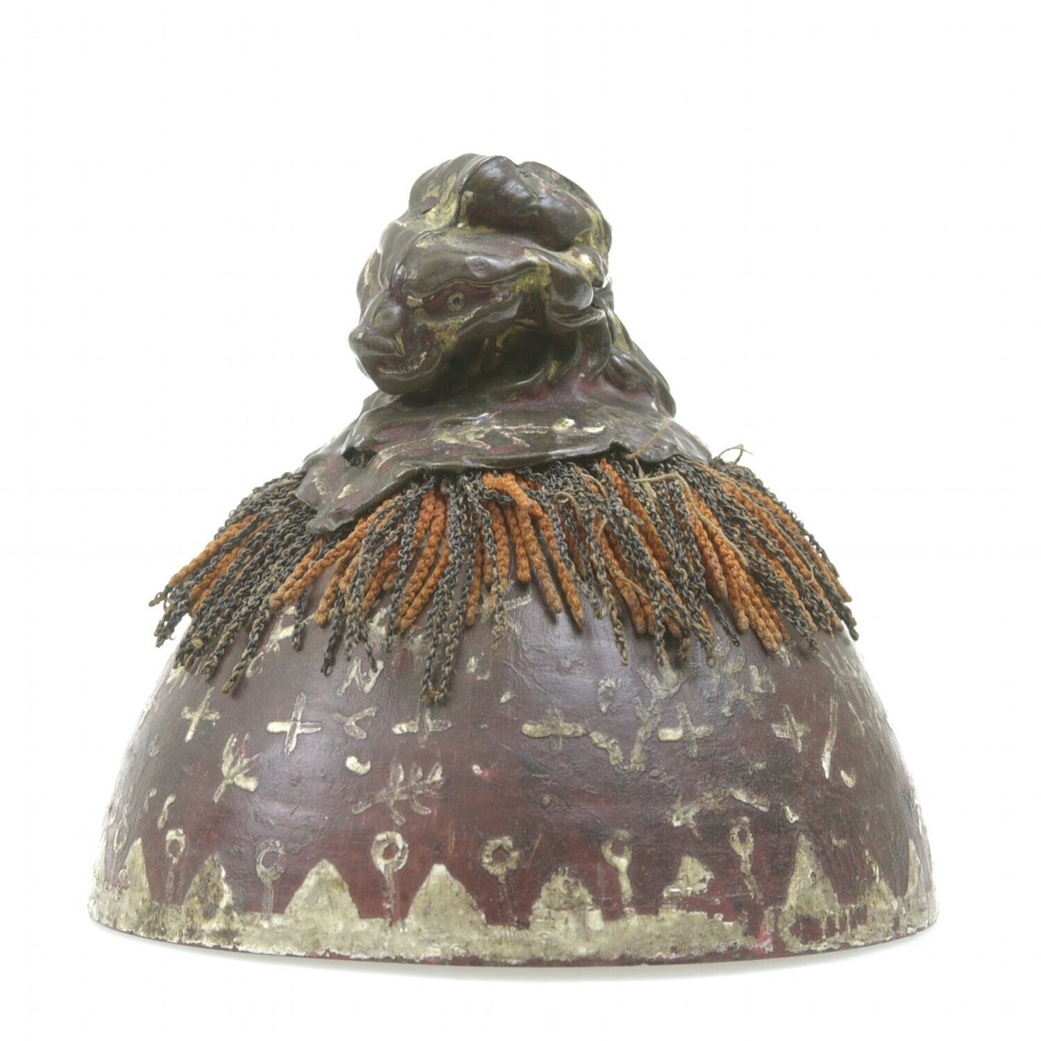 Halve kokosnoot met katoenen reepjes en een messinge...
