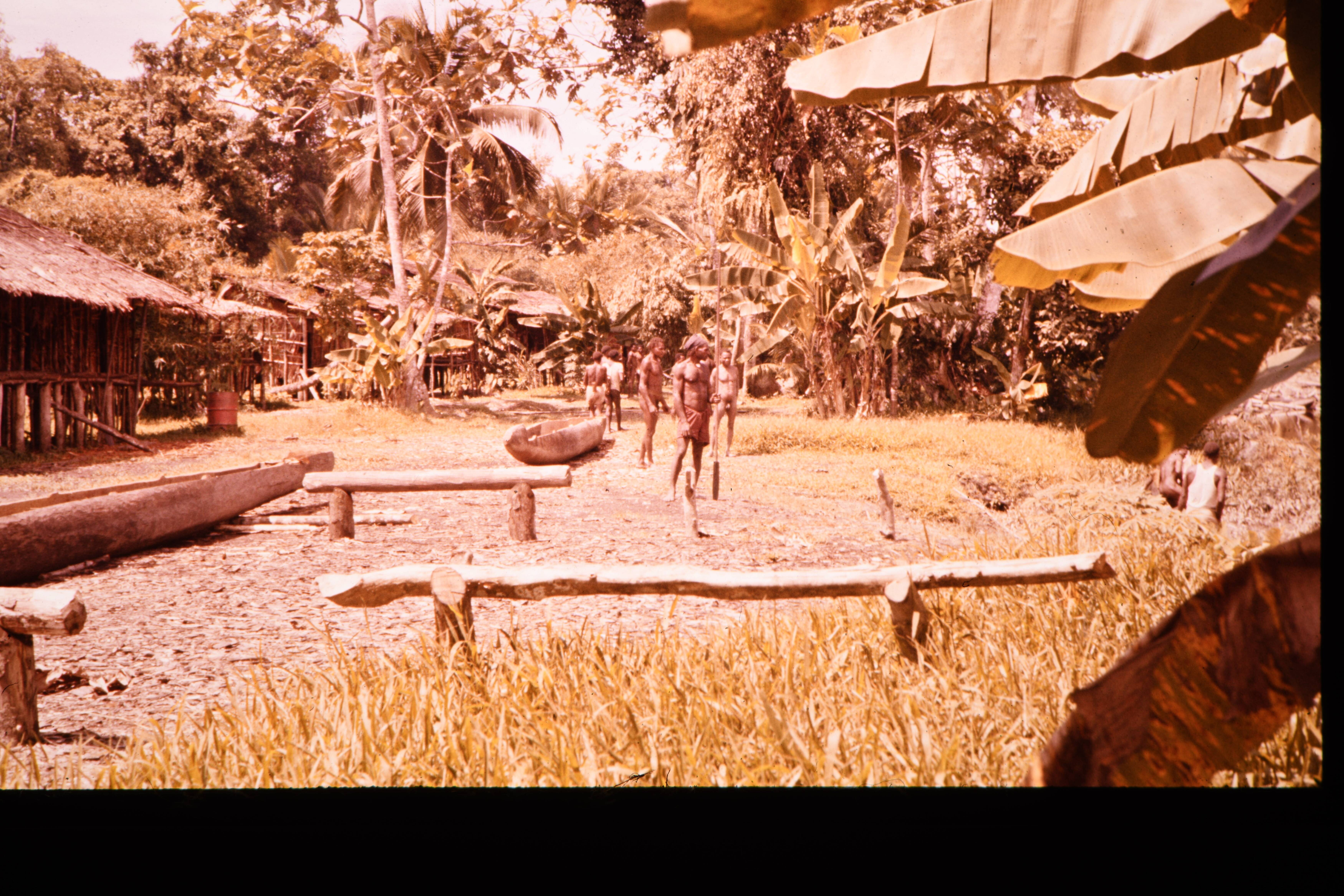 Zonsondergang in Warse. Op voorgrond groepje Papua's...