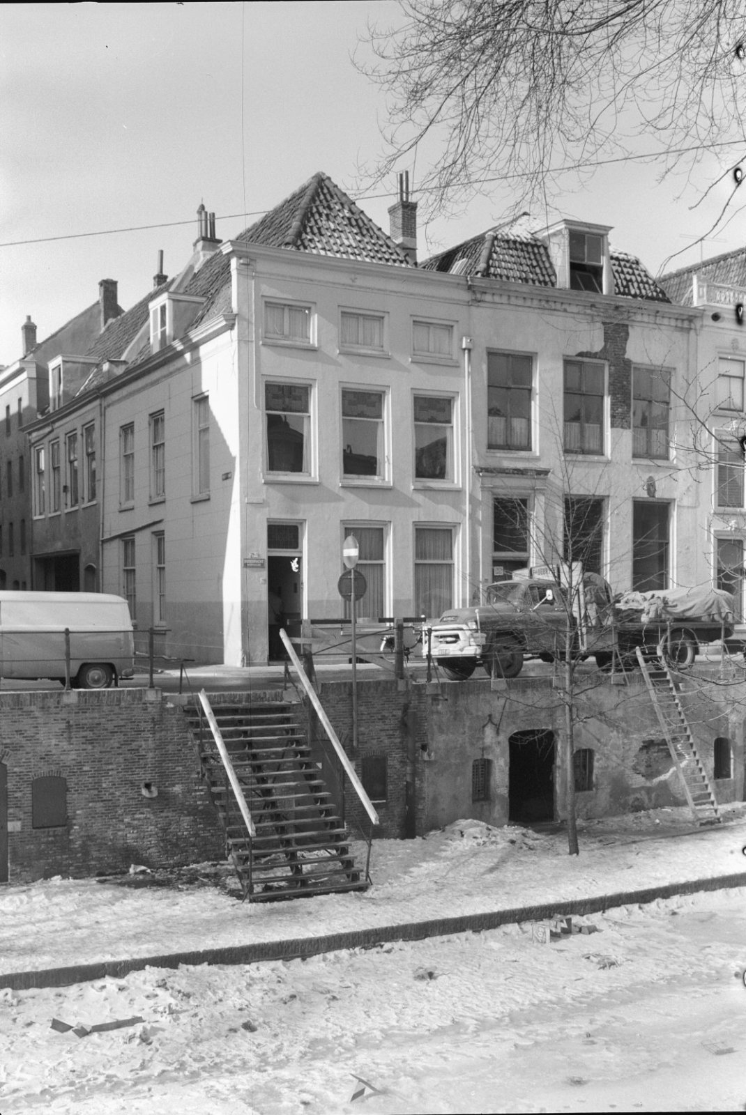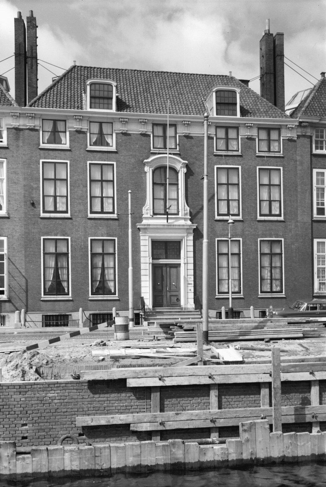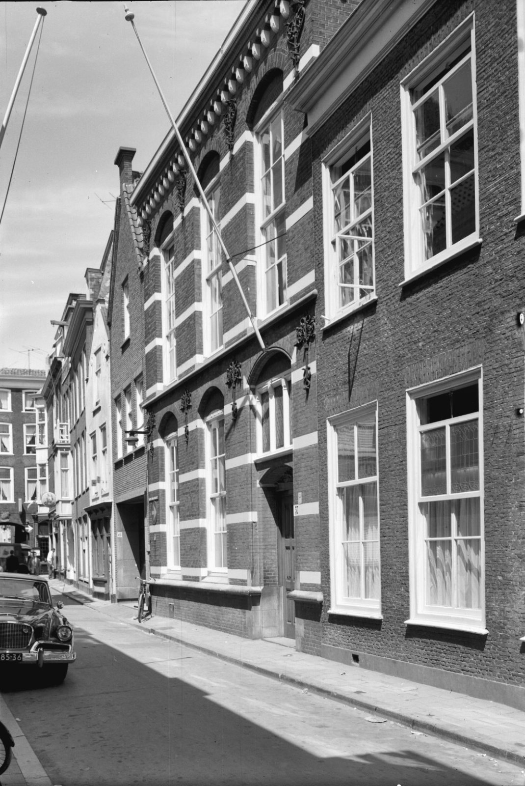 Voor- en zijgevel van eenlaags pand met ramen met ro...