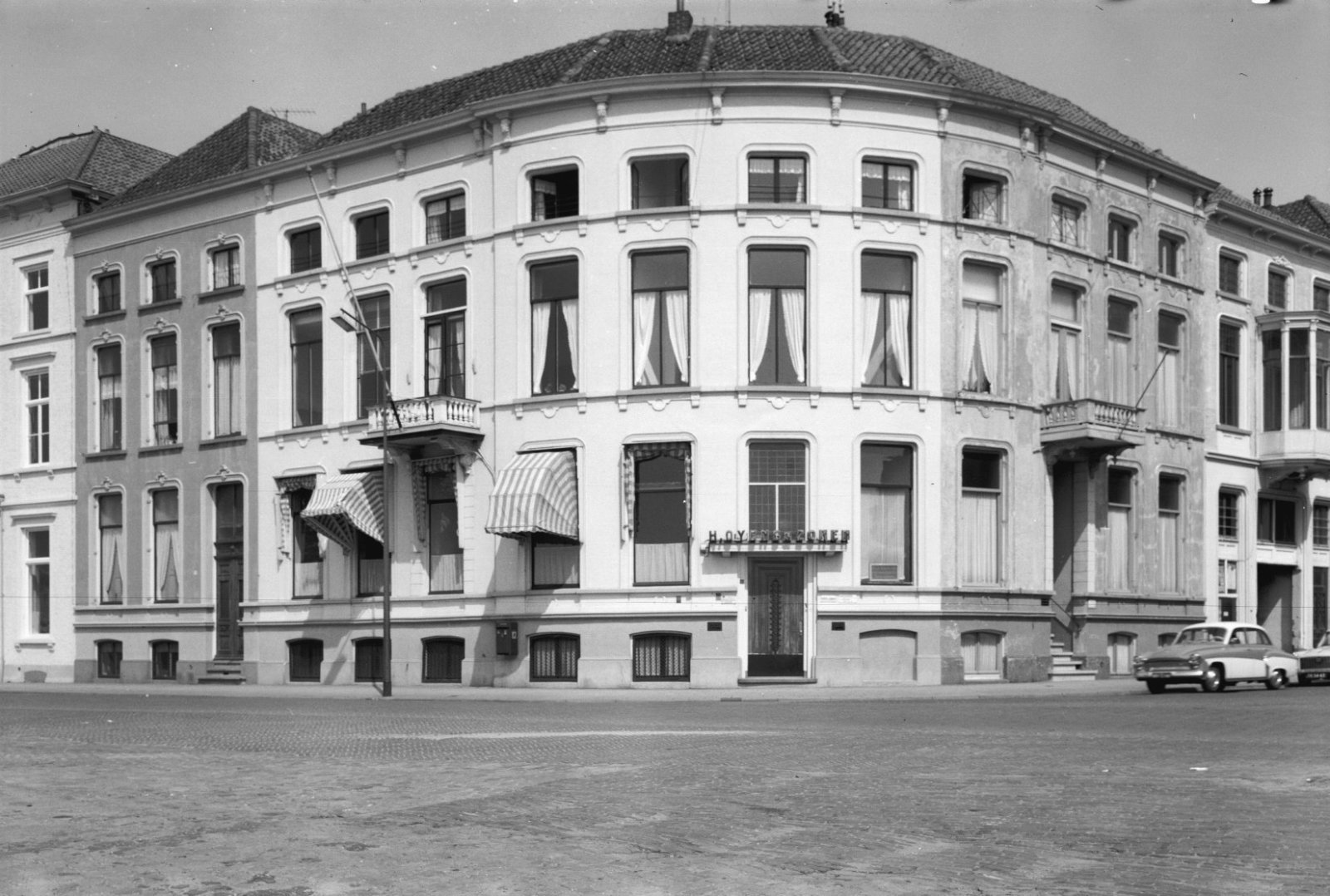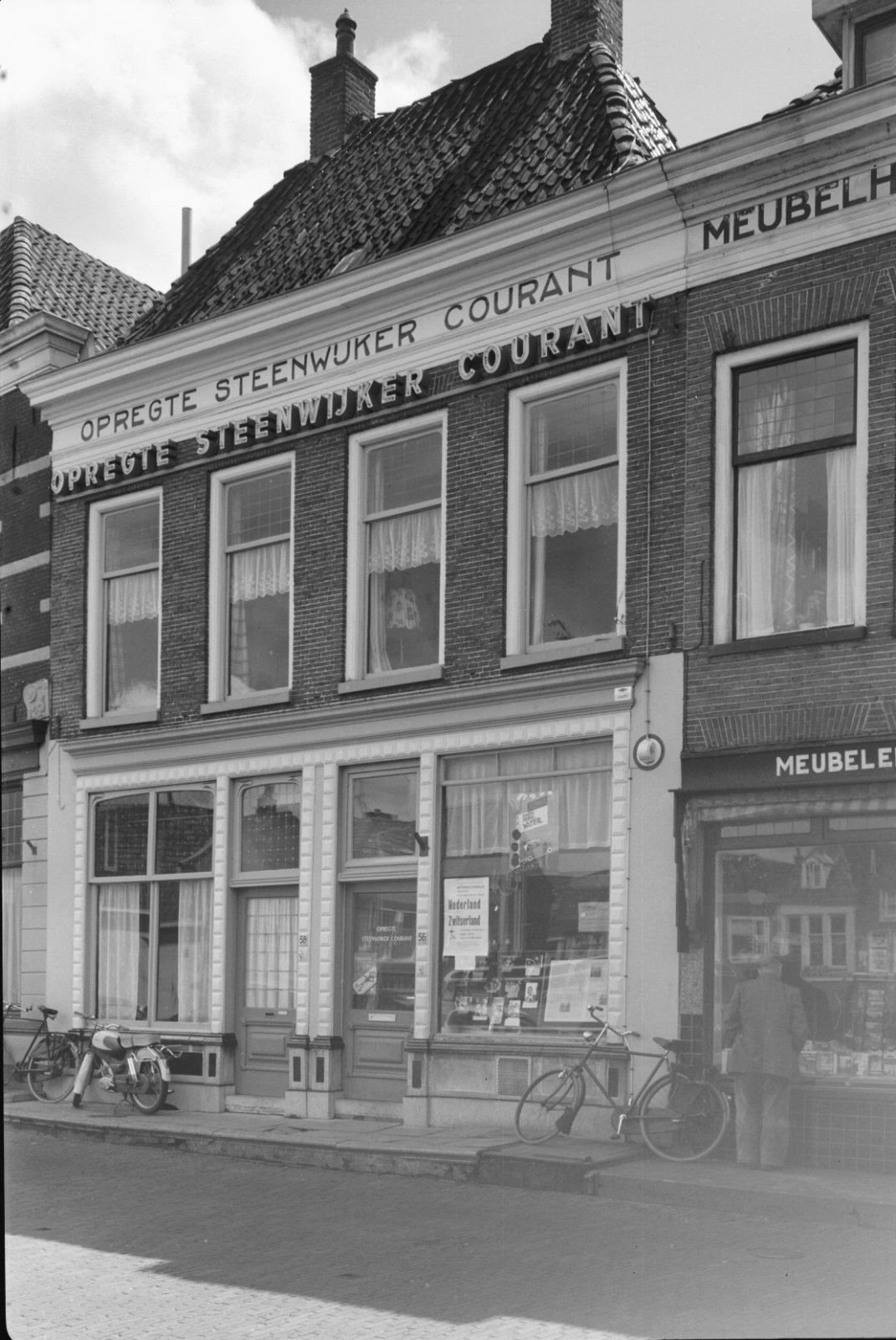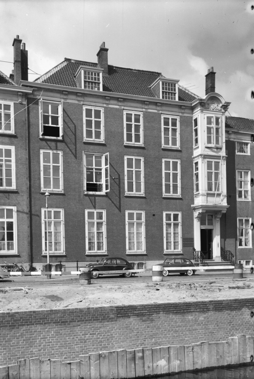 Voor- en zijgevel van eenlaags pand met ramen met ro...