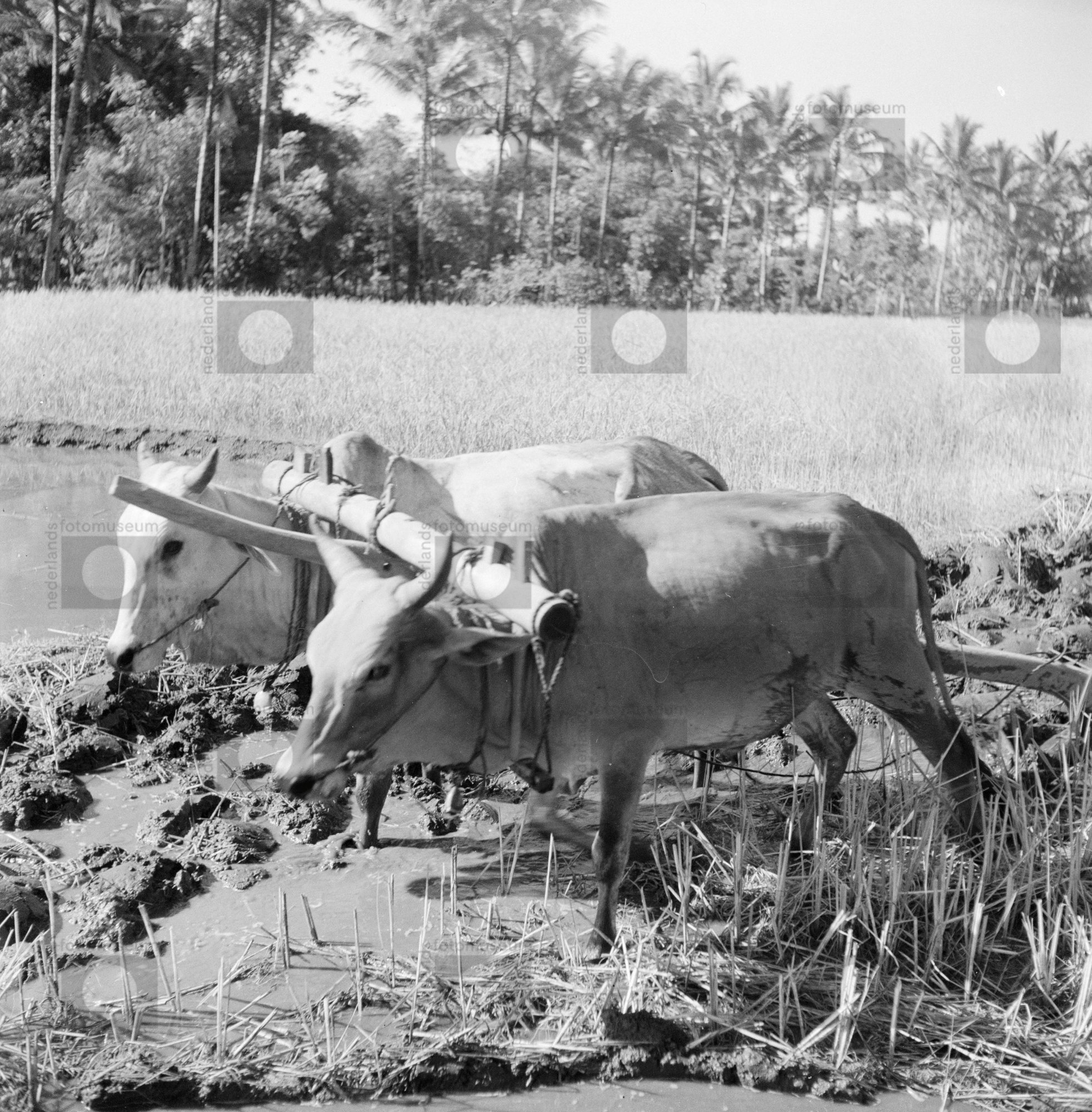 Man ploegt met karbouw en os een moerasrijstveld (sa...