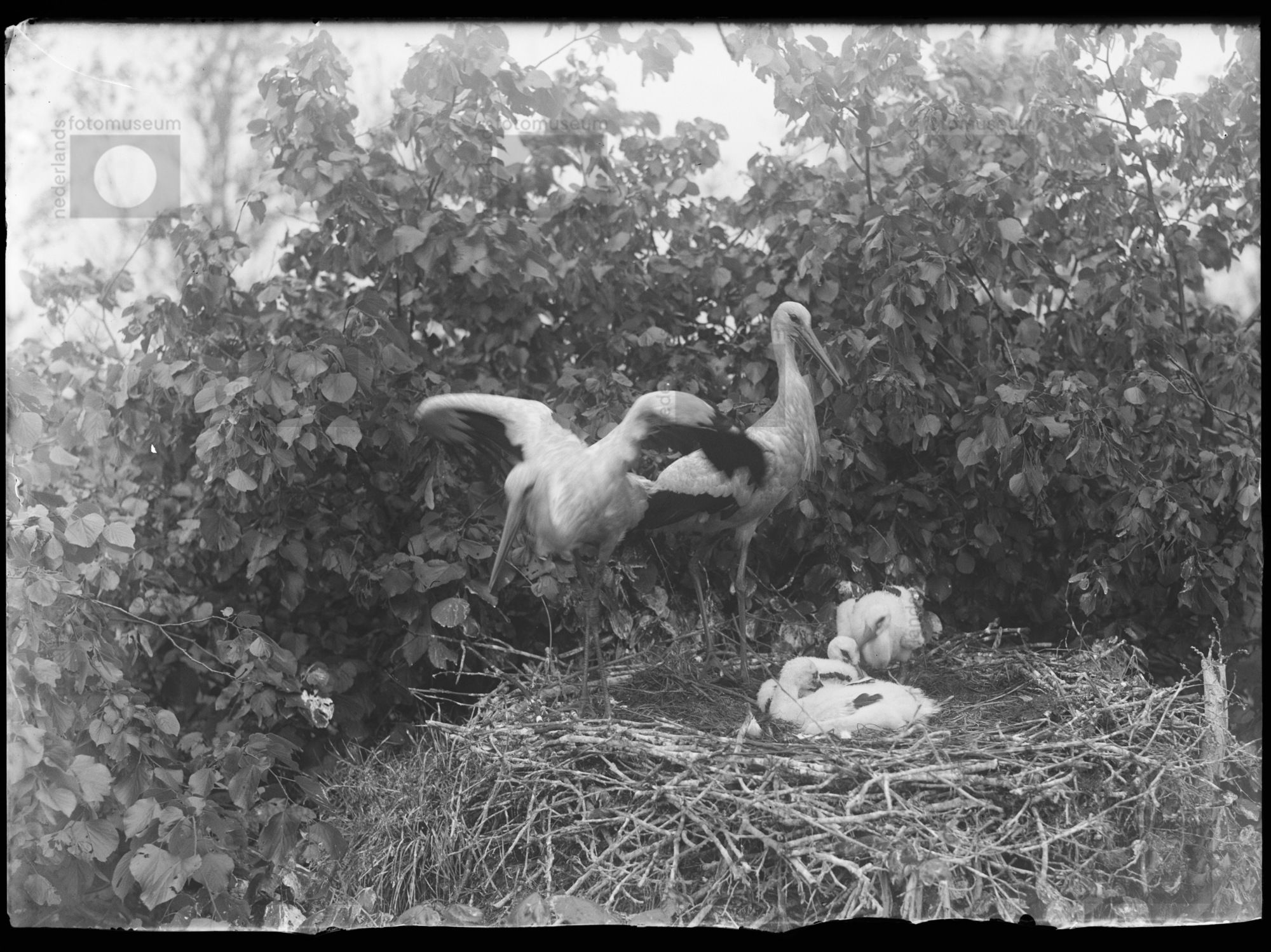 Ooievaars op het nest met jongen, Meppel (1944)