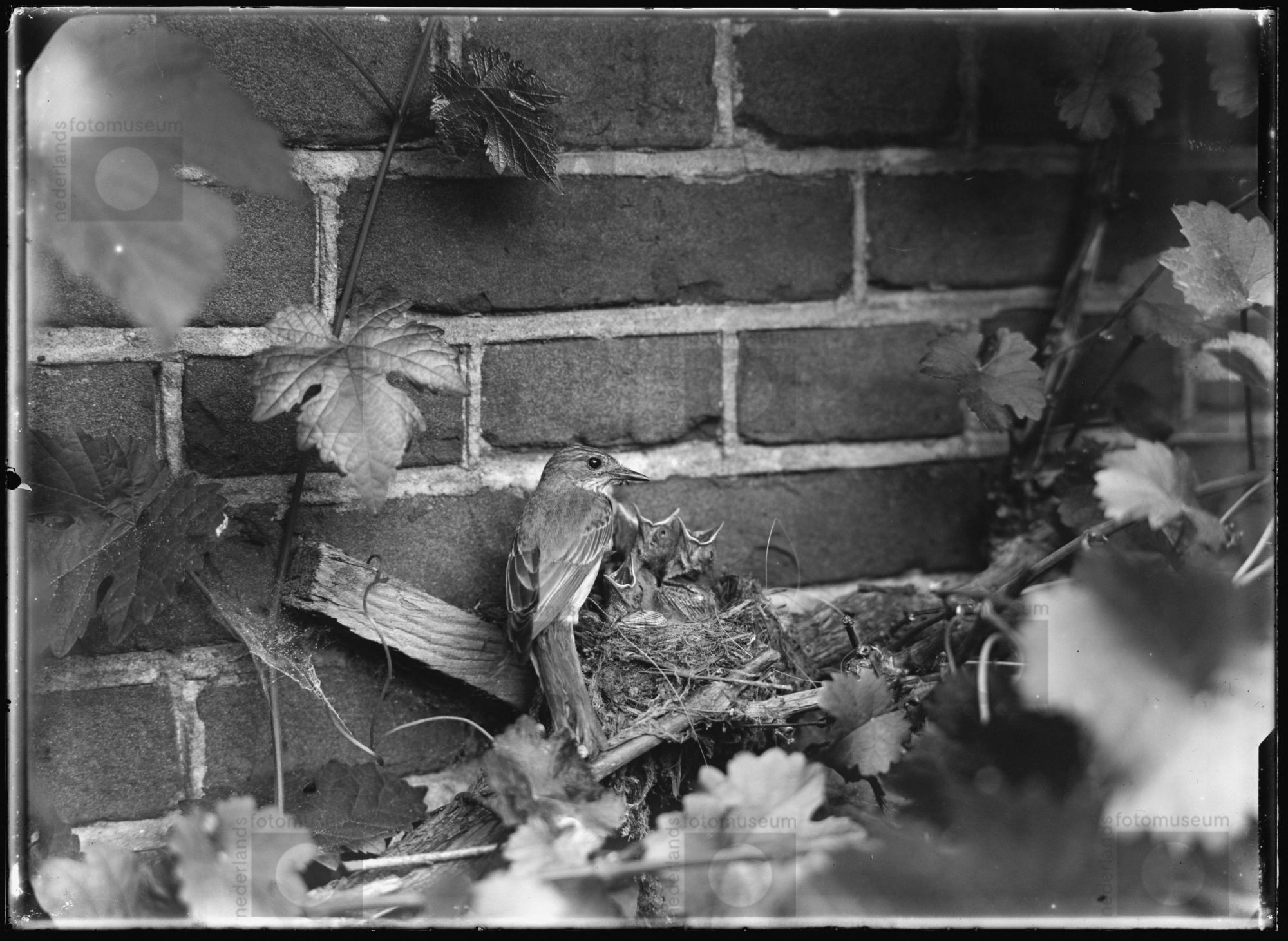 Grauwe vliegenvanger op rand van nest met jongen, Be...